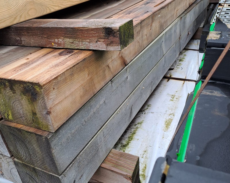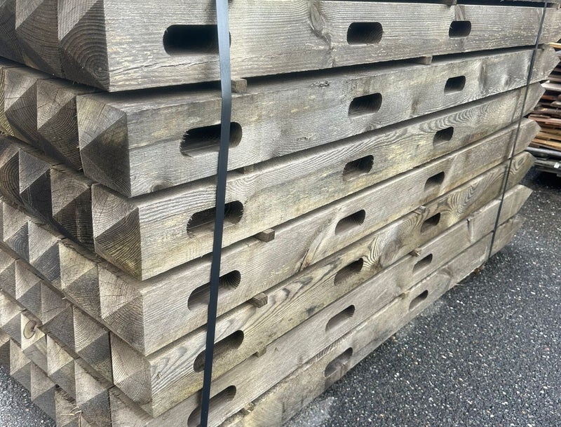 Ca 50 stuks half ronde houten regels diameter 10 en 12 cm verduurzaamd B-keus lengtes 5 en 6 meter. Opruiming € 1,50 per meter. Weg = weg